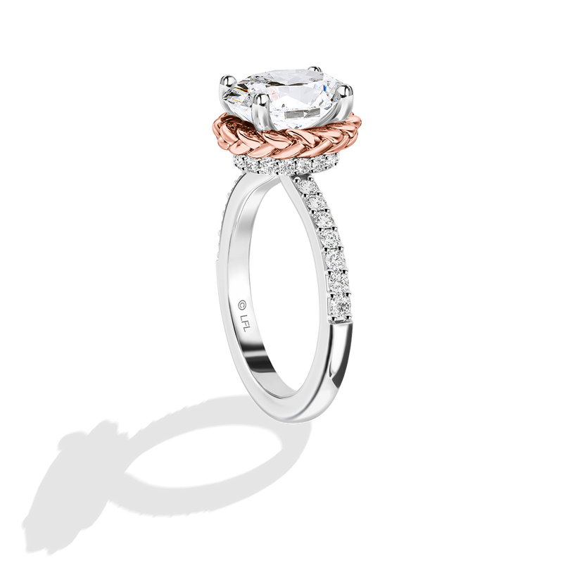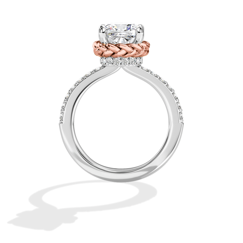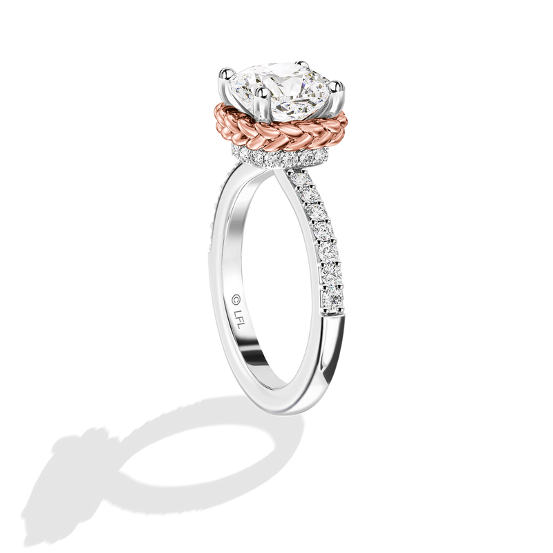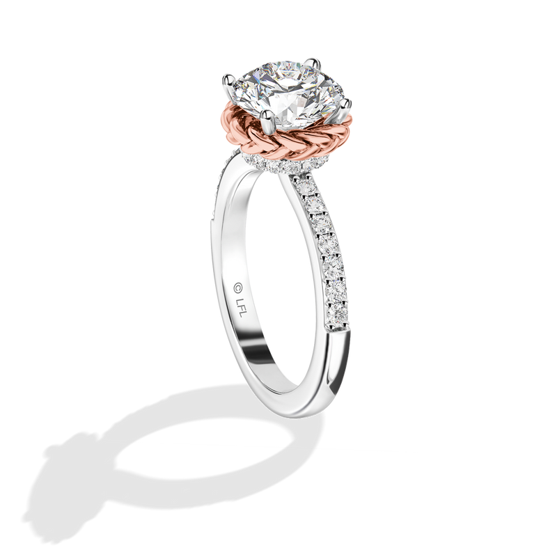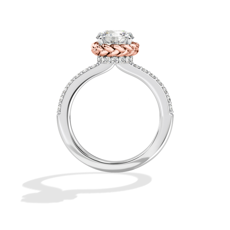 Crafted with precision and passion, this extraordinary ring is a tribute to the iconic Princess Leia, who captured hearts across the galaxy. At the heart of this regal creation rests a brilliant round lab grown diamond, symbolizing purity and everlasting love. Below, a delicate braided pattern in rose gold unfolds, reminiscent of Leia's intricate hairstyles. Beneath the rose gold braid, a hidden halo of diamonds emerges, adding a layer of opulence to the ring. The shoulders of the ring are gracefully adorned with additional lab grown diamonds, extending the elegance. May the force of your commitment be as enduring and radiant as the princess who inspired this masterpiece.