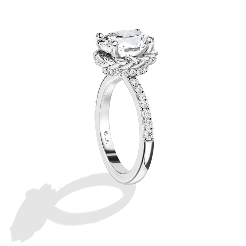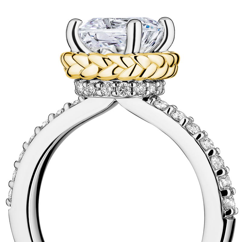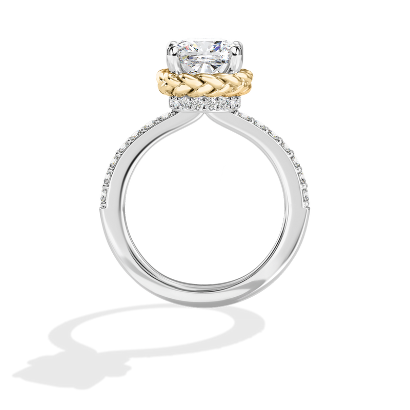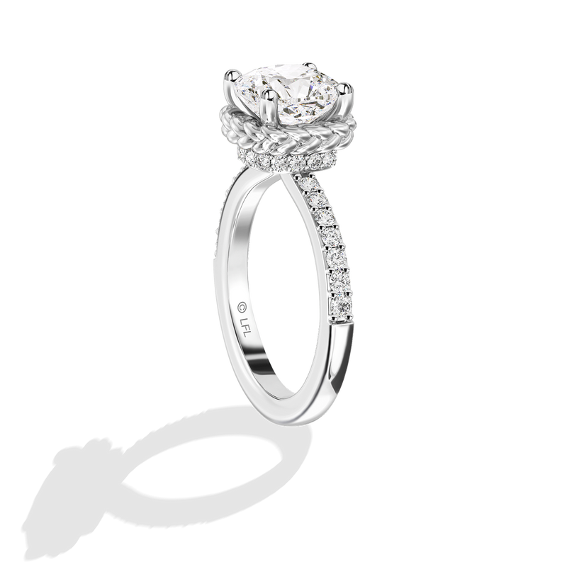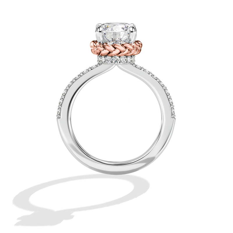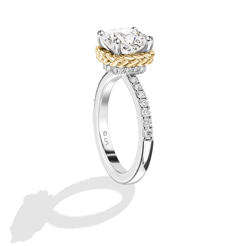 Crafted with precision and passion, this extraordinary ring is a tribute to the iconic Princess Leia, who captured hearts across the galaxy. At the heart of this regal creation rests a brilliant round lab grown diamond, symbolizing purity and everlasting love. Below, a delicate braided pattern in rose gold unfolds, reminiscent of Leia's intricate hairstyles. Beneath the rose gold braid, a hidden halo of diamonds emerges, adding a layer of opulence to the ring. The shoulders of the ring are gracefully adorned with additional lab grown diamonds, extending the elegance. May the force of your commitment be as enduring and radiant as the princess who inspired this masterpiece.
