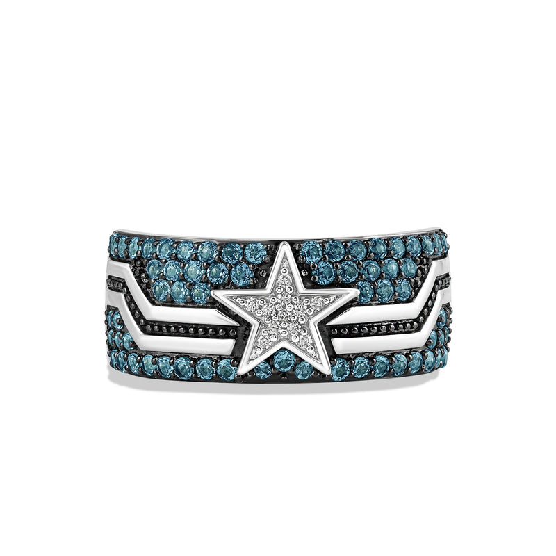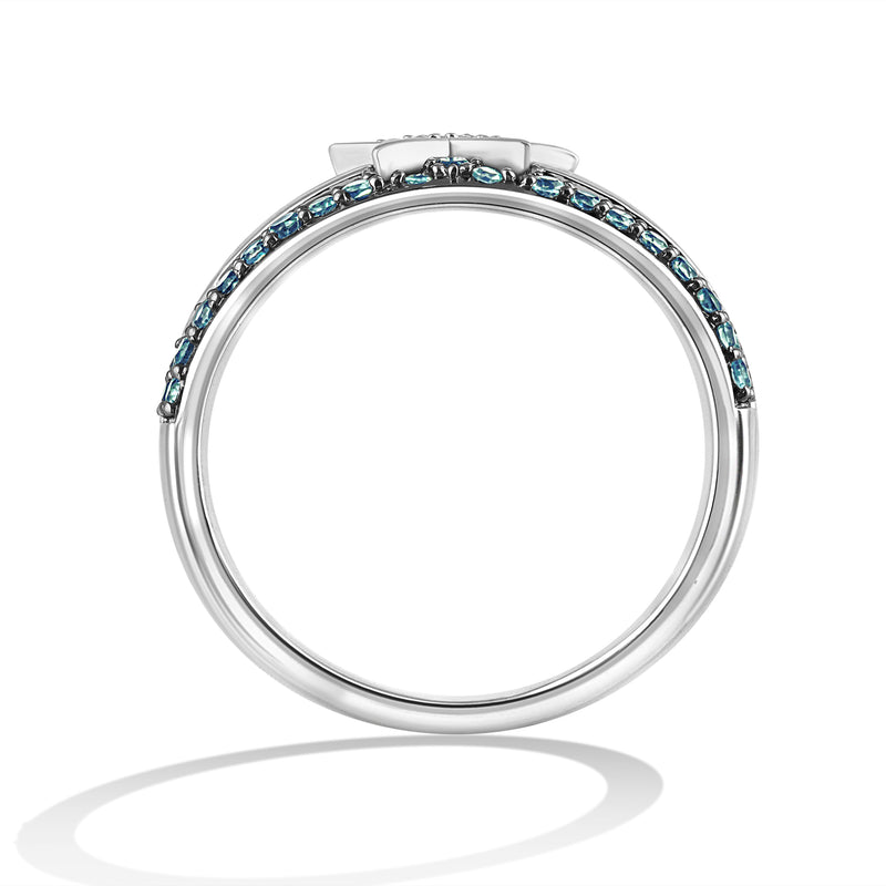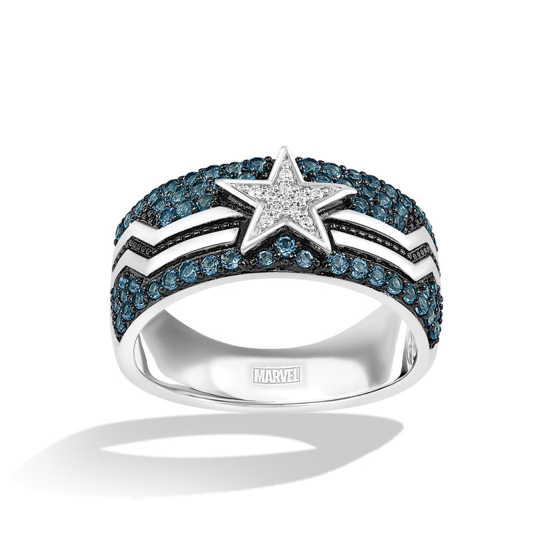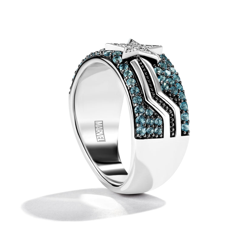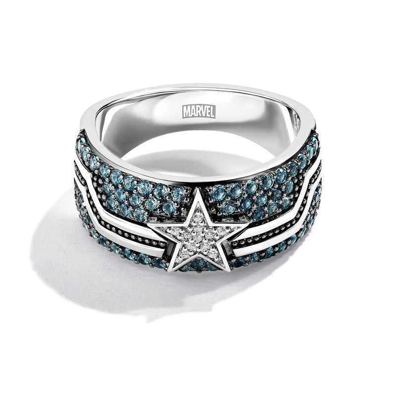 Embrace the spirit of Captain America with this masculine and timeless ring. Set in sterling silver, the ring features 1/20 CT.TW. of sparkling diamonds, complemented by rich Swiss blue topaz. The topaz mirrors Captain America’s resolute strength and integrity, while the diamonds add an element of class. Perfect for those who admire the heroism of Captain America or anyone seeking a distinctive piece of jewelry, this ring is a bold, stylish addition to your collection.