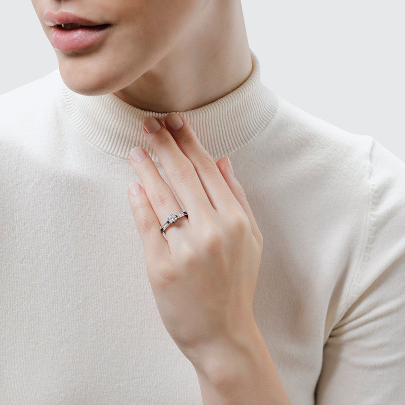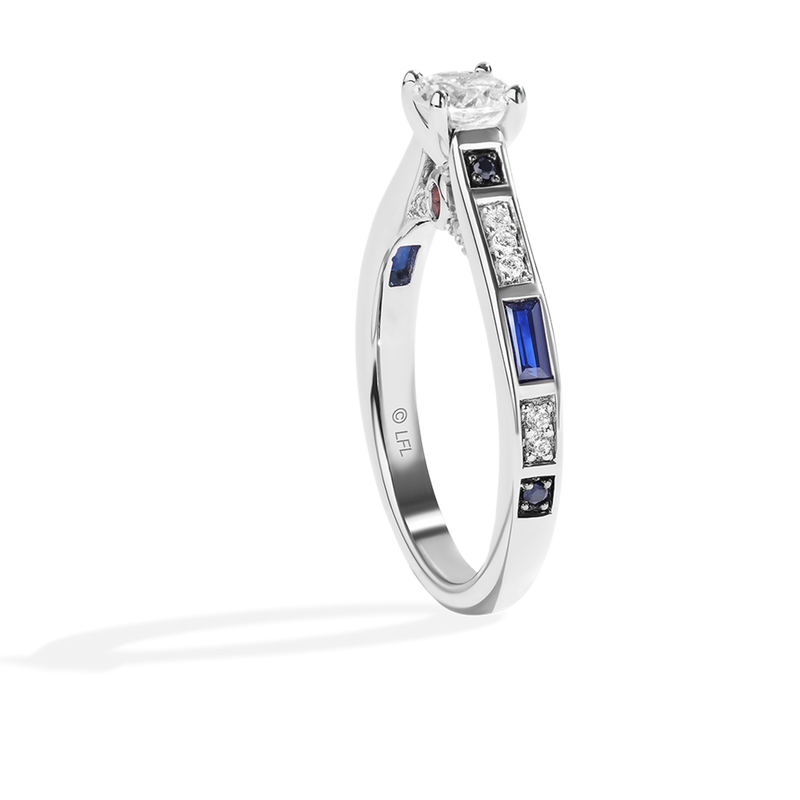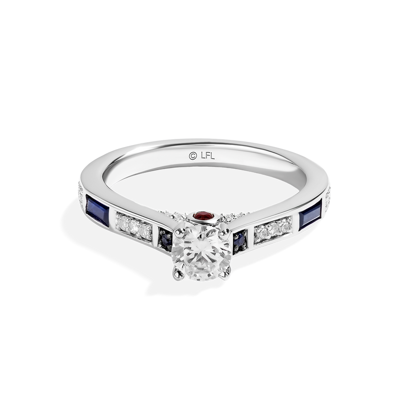 For a love that spans lifetimes, the R2-D2™ collection is the perfect choice. Let them know they're your only (and truest) hope with a gorgeous central diamond offset with garnets and sapphires, all set in stunning 14k white gold.