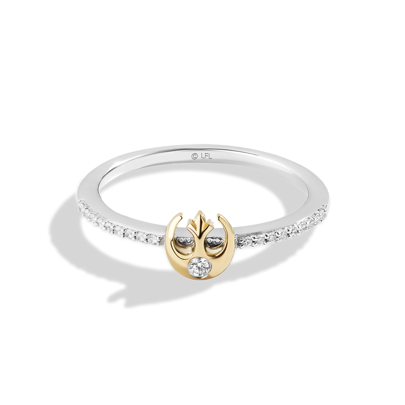 Take a stand against the Galactic Empire and join the Rebel Alliance with this dainty stackable ring featuring a sterling silver and diamond band with a 10k yellow gold Rebel symbol with diamond accent.