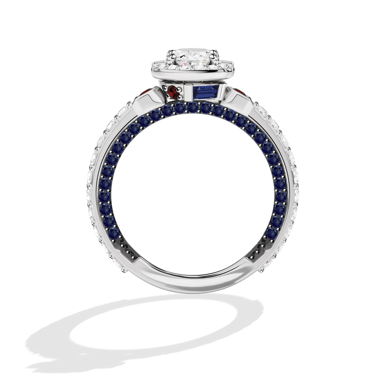 Crafted for the woman whose love feels written in the stars, this Galaxy Star Engagement Ring captures the spirit of an unbreakable bond. Inspired by R2-D2™ ’s loyal heart and cosmic charm, this celestial design features a stunning constellation of lab grown diamonds, a radiant blue sapphire, and a deep garnet—each symbolizing trust, passion, and destiny.
