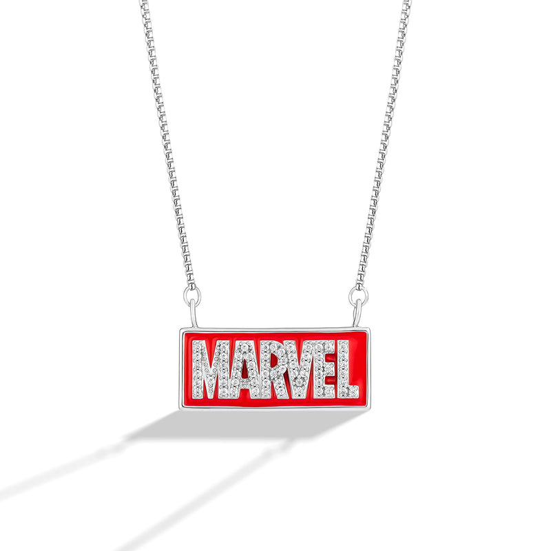 Bright red enamel brings instant impact to the iconic MARVEL engraving, turning a single word into a full statement. With, 1/5 CT.TW of white diamonds catch the light with every move, contrasted by sleek sterling silver that keeps the look crisp, cool, and unmistakably bold. Big energy. Loud sparkle. And absolutely no holding back.
