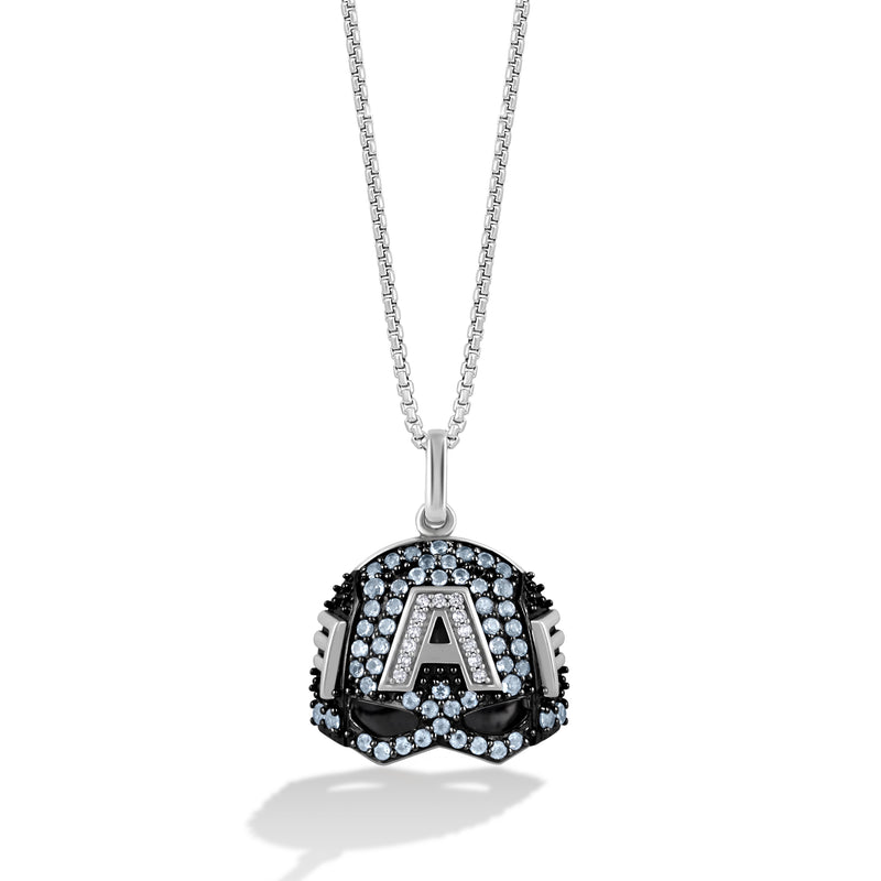 Capture the spirit of Captain America with this elegant women’s necklace. Featuring 1/20 CT.TW diamonds and a striking Swiss blue topaz, the pendant showcases a detailed Captain America helmet design, a key symbol of the hero’s strength, courage, and resilience. Crafted in sterling silver, this necklace brings the iconic helmet to life, making it not just a piece of jewelry, but a powerful tribute to the unwavering bravery of the hero. A perfect balance of elegance and heroism, this piece is an essential addition for any fan.